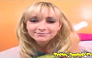 Horny blonde teen licks her own nipples before sucking on stiff man meat