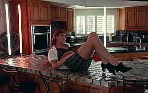 Scarlett comes back for more 5K action ! She makes herself at home on the kitchen counterpunch in her cute schoolgirl outfit. That picayune plaid dame does n't hide her plenteous asset and she loves teasing you with a coup d'oeil of her shaved pussy through those sheer White person step-in .
