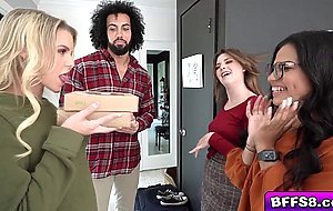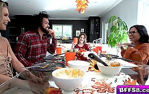 5:40Best friends Summer, Evelyn and Alex's thanks giving dinner turned into a wild foursome with James Angel, who alternately bangs them. The girls slobbers his big hard cock, before they spread wide their legs for his massive dick, tat will penetrate their pink tight cunts
