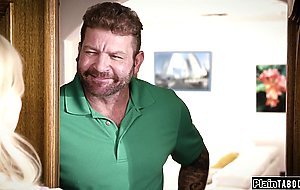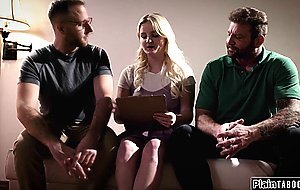 Big boobs teen seduces by two horny older guys.They lift up her shirt and pinch their nipples befoe the busty blonde deepthroat their cocks.The coed gives a blowjob while riding dick with her shaved snatch.She is then double pussy penetrated