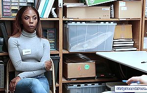 A security guard caught an ebony teen cashier stealing cash from store.The shoplifter cooperates after strip search and blowjbos the officers big cock while masturbating.The guy licks and fingers the big tits brunettes shaved pussy then ass fucks her.