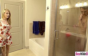 5:19Teen stepsister Hannah Hays finds her stepbrother in the shower and sucks his big cock Elsa Jean opens the door and spies on them rubbing her pussy She then follows them to the bedroom where he finds Hannah getting fingered and joins them for a threesome