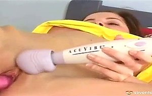 A teenage girl wearing only panties and a T-shirt is laying on the bed, gently stroking her whole body. She takes her panties off, showing her trimmed pussy, and lifts her T-shirt to reveal her tits. The she masturbates using a vibrator and a large massager.