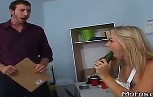 Melanie Jayne is late for work at the grocery store and the manager is livid. When she finally gets there she has to put away all the new stock that came in. When she is handling the cucumbers, it reminds her of what she was doing before work. The manager stumbles in and catches her with a cucumber in her pussy. He can't help getting a hard on watching her with the cucumber. She takes matters into her own hands by getting a hold of his giant cock and putting in her mouth.