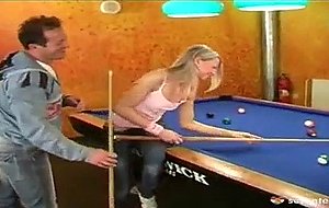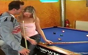 A blonde teenager is at a snooker table, getting lessons from a guy that stands behind her. After a couple of unsuccesful shot they start kissing each other. He lifts her shirt up and licks her nipples. Then she gets down on her knees to give him a blow job before she gets fucked on top of the table.