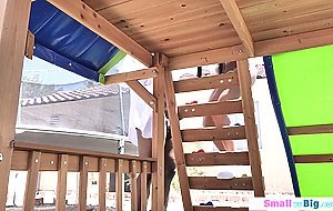 A petite asian flirts with her black stepdad.Later on,her stepdad gives in and so she takes her pants down and lets him fuck her in their playground.Then they go to the kitchen where she compares her stepdads bbc with an icepop and then sucks on it.