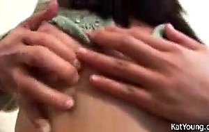 Kat Young does a sexy strip tease taking off her green Cardigan and tight Denim Shorts