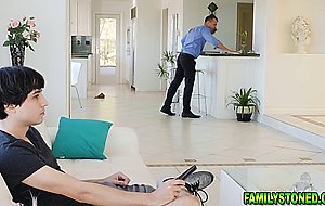 6:27Horny teen Nikole Nash loves teasing her stepbrother Ricky Spanish when he hides the remote inside his pants she is not afraid to reach in for it and even whips out his cock and starts sucking it making him cum while behind their stepdads back