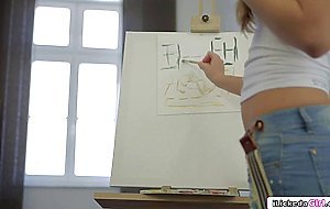 A blonde teen acts as nude model for her lesbian friend.The lesbian babe joins her on the couch and kisses her.She grabs on her natural tits and plays with them.Then she licks her shaved pussy.Her petite bff masturbates her in return fingering her.