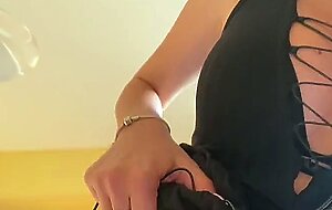 a depraved bitch in a black dress stretches her pussy for a big dick